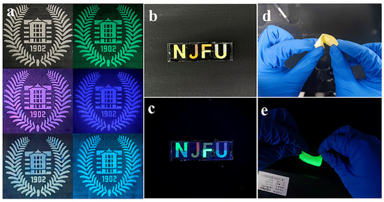 On the one hand, electrospinning offers the advantage of producing large-area, highly stable fluorescent nanofiber films; on the other hand, the flexibility (Figure 7d,e) of the nanofibers themselves allows for arbitrary cutting and assembling into any desired pattern, which renders them suitable for applications in anti-counterfeiting and WLED [33,34]. Thus, leveraging the foldability of nanofiber films attempts to cut multicolor CsPbX3/PAN composite films into different patterns (Figure 7). Figure 7a–c, respectively, show fluorescent patterns (a school badge and the letters NJFU) composed of individual multicolor CsPbX3/PAN composite films created by cutting and assembling CsPbX3/PAN composite films with various compositions under UV excitation (λ = 365 nm) in dark conditions. The excellent display performance implies potential applications in the field of multicolor anti-counterfeiting. This utilization of electrospun nanofiber films showcases promise for future advancements in multifunctional materials for security and display technologies.