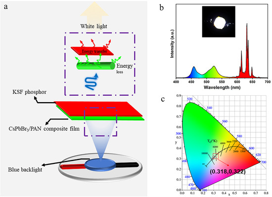 Benefiting from the exceptional PL performance and good long-term stability of CsPbX3/PAN composite nanofibers, white light-emitting diodes (WLEDs) were successfully fabricated using CsPbBr3/PAN composite film and red-emitting KSF phosphors. Figure 8a illustrates the operational principles of the WLED, wherein a blue light-emitting diode (LED) emitting at a wavelength of 460 nm is selected as the excitation light source. The KSF and CsPbBr3/PAN composite film are combined and overlaid onto the LED. Following this, they are encapsulated and cured with organic adhesive, which results in a simplified WLED device [35]. Performance testing of the prepared WLED under a 20 mA drive current, as shown in Figure 8b, reveals distinct emission peaks in the blue, green and red spectral ranges. The inset presents actual emission photographs of the WLED device, providing a clear depiction of its ability to emit bright, pure white light. Finally, based on Figure 8c, the WLED device exhibits CIE coordinates of (0.318, 0.322), placing it within the white light region with a color temperature of approximately 6000 K [36]. Taking into account the chemical stability of the CsPbBr3/PAN composite film, it shows significant potential in light-emitting devices.