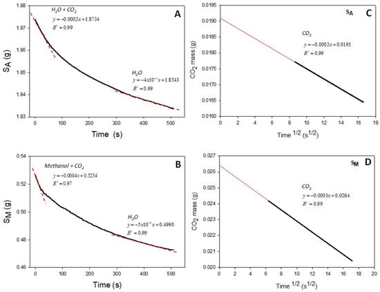 Chitin hydrogels for the SCF treatment had an average mass of 5.4 ± 0.4 g, a thickness of 1.8 ± 0.2 mm, and a diameter of 5.9 ± 0.3 cm. The effect of the co-solvent on the formation of porous scaffolds from the hydrogels showed significant differences in the mass and diameters of the products (Tables S1 and S2). The mass loss curves for the SA and SM scaffolds due to the desorption of CO2 at room temperature in Figure 1A,B displayed an initial linearity (upper red trace) for the combined desorption of CO2 and loss of moisture. However, after 300 s (lower red trace), the loss of mass only corresponded to that of moisture. The linear regression of both sections provided the mass of the absorbed CO2; shrinkage and significant mass loss were observed after the foaming process with scCO2, using water and methanol as co-solvents. Similarly, Tsioptsias and Panayiotou [] reported this behavior for porous chitin materials.