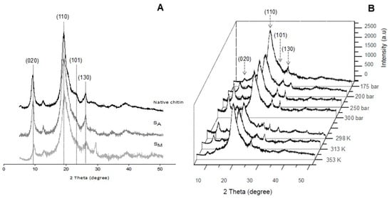 X-ray diffraction patterns of native chitin and chitin treated with scCO2 (A) at 175 bar and 353 K using water (SA) and methanol (SM) as co-solvents, and (B) SM scaffolds obtained at different temperatures and pressures.