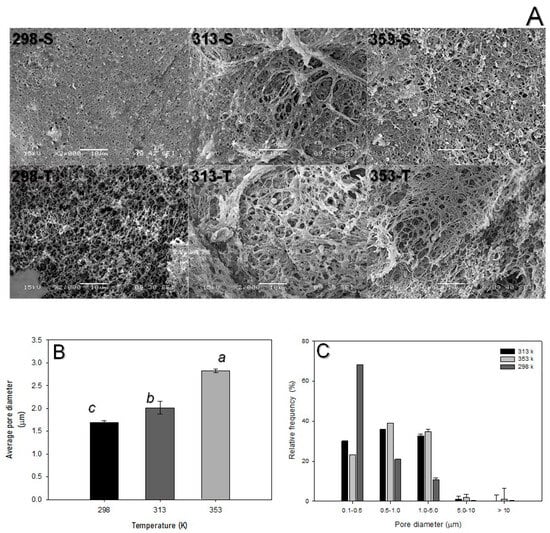 SEM micrographs of SM after scCO2 (S: surface, T: transverse) (A). Average diameter (B) and distribution of the pores (C) at different temperatures and constant pressure (175 bar). The different letters in the histograms mean that they are statistically different (Tukey–Kramer p ≤ 0.05).