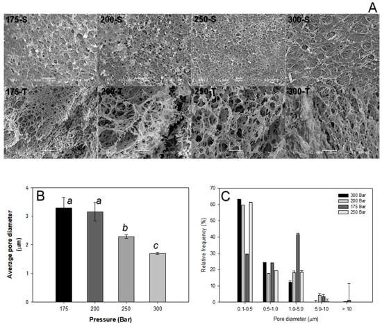 SEM micrographs of SM after scCO2 (S: surface, T: transverse) (A), average diameter (B), and distribution of the pores (C) at different pressures and constant temperature (353 K). The different letters in the histogram mean that they are statistically different (Tukey–Kramer p ≤ 0.05).