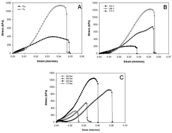 Stress–strain curves for SCF-treated SA and SM samples at 353 K and 175 bar (A) and for SM samples at different temperature (B) and pressure (C) conditions.
