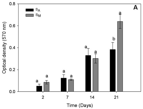 The proliferation of human osteoblasts in the scaffolds was assessed by the MTT assay for the SM and SA samples, obtained at the best processing conditions with regard to pressure and temperature (175 bar and 353 K). After 2, 7, and 14 days of incubation, the number of cells showed no significant differences for either scaffold; however, cell proliferation was observed in both scaffolds. The level detected was double the number of cells in the SM and the SA scaffolds from day 2 to day 14 of cell culturing. After day 14 of cell culturing, the cell proliferation rate in SA decreased in comparison with that in SM. By day 21, the SM scaffold showed the highest cell proliferation, with a significantly larger number of cells compared to SA, where the number of metabolically active cells did not significantly increase from day 14 to day 21 of cell culturing. In SM, the number of metabolically active cells increased two-fold at 21 days of culture in comparison with the number of cells observed in the same scaffolds at 14 days of cell culture (Figure 7).