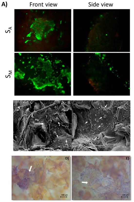 Cell viability of human osteoblasts cultured for 14 days in scCO2-mediated porous chitin SM and SA scaffolds. Shown from front (surface) and side (cell penetration) views (A). Viable cells are shown in green, while non-viable cells are shown in red. SEM micrographs of human osteoblasts (white arrows) cultured on scCO2-mediated porous chitin SA (B) and SM (C) scaffolds after 21 days of cell culture. Representative H&E staining micrographs showing the cell nuclei (white arrows) of human osteoblasts monolayers on scCO2-mediated porous chitin SA (D) and SM (E) scaffolds after 14 days of cell culture.