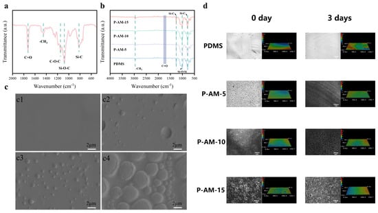 The preparation process of a silicone-based amphiphilic gel coating is shown in the Scheme 1c. PEG-MA was used as the hydrophilic monomer, while TPMA served as the crosslinking agent to generate a non-crosslinked polymer chain by radical polymerisation []. To mitigate excessive expansion of the hydrophilic polymers in aqueous environments, high-molecular-weight HO-PDMS-OH was incorporated. The PDMS, METES and non-crosslinked polymer chains were mixed together, followed by the hydrolysis of the silane to produce silanols. These silanols were then subjected to dehydration condensation to form the silicon-based amphiphilic gel coating. The FT-IR spectrum of AM is shown in Figure 1a and shows the presence of absorption peaks corresponding to C=O (1725 cm−1), -CH3 (1448 cm−1) and C-O-C (1145 cm−1). Furthermore, the absorption peaks at 1078 cm−1 and 816 cm−1 could be attributed to the Si-O-C and Si-C groups, respectively. Notably, no absorption peak associated with the C=C group (1637 cm−1) was observed in the spectra, providing evidence for the successful synthesis of AM polymers by free radical mechanisms. The chemical structure of AM was characterised by 1H NMR spectroscopy (Figure S1). δ 0.77–0.96 (Si-CH2) were the methylene proton absorption peaks of Si-CH2-CH2 in TPMA. δ 3.50–3.60 (Si-O-(CH3)3) was attributed to the proton peaks of the three methyl groups of the TPMA end group. δ 3.60–3.65 (O-CH2-CH2-O) were the methylene proton peaks on the PEG-MA segment []. The signals at δ 4.10–4.20 and δ 4.30–4.35 were assigned to the methylene protons (C-O-CH2) originating from TPMA and PEG-MA, respectively. Combining δ 1.88–1.97 (Si-CH2-CH2), δ 3.30–3.48 (O-CH3) and δ3.65–3.80 (O-CH3) [,], it is evident that the non-crosslinked polymer chain segment polymers were successfully prepared by radical polymerisation reactions with the three monomers. Subsequently, by introducing a minute amount of catalyst, the siloxane on the AM branched chain undergoes dehydration condensation with PDMS and METES, forming an amphiphilic crosslinked network by curing. Four different AM/PDMS ratios were prepared and characterised by ATR-IR (Figure 1b). The characteristic absorption peaks at 861 cm−1 and 1260 cm−1 indicate the Si-C stretching vibration, while the characteristic peak of -CH3 was shown at 2960 cm−1. Furthermore, the characteristic peak of the Si-O-Si group at 1003 cm−1 confirmed the occurrence of a condensation reaction during the curing process of the coating. Interestingly, with increasing AM addition, the characteristic absorption peak of νC=O can be observed at 1730 cm−1 on P-AM-15, indicating the successful formation of a co-network between AM and PDMS by condensation, accompanied by migration to the surface of the coating.