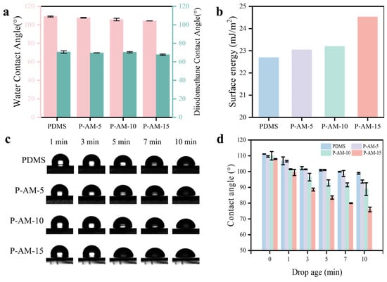In this study, the wettability and surface energy of these coatings are investigated in Figure 2a,b. Figure 2a shows that the PDMS coating has a water contact angle of 108.99°. Its highly hydrophobic nature is attributed to the rapid orientation of methyl groups on the surface, resulting in a low surface tension and achieving a hydrophobic effect. The contact angle of the coating decreases slightly as the AM content increases. This phenomenon can be attributed to the preferential migration of high-molecular-weight PDMS towards the air–polymer interface during film formation, thereby maintaining the hydrophobicity of the coating. The surface energy of each sample was determined using the Owens–Winter method (Figure 2b). The γD and γP are summarised in Table S2. The surface energy of the coating is directly proportional to the content of polymer chain segments. It is known that γP is determined by the intermolecular forces between polar molecules in the material []. Increasing the content of the AM will result in a corresponding increase in γP, thereby inducing an increase in surface energy. To further investigate the surface properties of the coating, the water dynamic contact angle was tested and shown in Figure 2c,d. Neither PDMS nor P-AM-5 show significant changes in the dynamic contact angle, with a value still above 90° after 10 min. Both P-AM-10 and P-AM-15 show a rapid decrease over time, particularly P-AM-15, which decreases from 89° to 74° in 3–10 min. The hydrophilic chain of P-AM-15 gradually migrates from the interior to the surface of the coatings after 3 min. This phenomenon means that the coating accumulates hydrophilic groups on its surface after immersion in seawater, forming a hydrated layer []. At the same time, PEG-MA exhibits remarkable anti-protein properties, reducing non-specific protein binding to the hydrophobic surface and giving the coating antifouling properties.