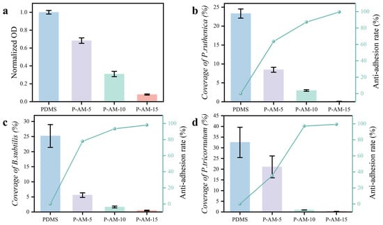 The surface area covered by B. subtilis, P. ruthenica and P. tricornutum adhering to the PDMS coating was quantified as N1. Similarly, the surface area covered by these microorganisms on the P-AM-x coating was measured and recorded as N2 []. The anti-adhesion rate (R) was calculated using Equation (4):