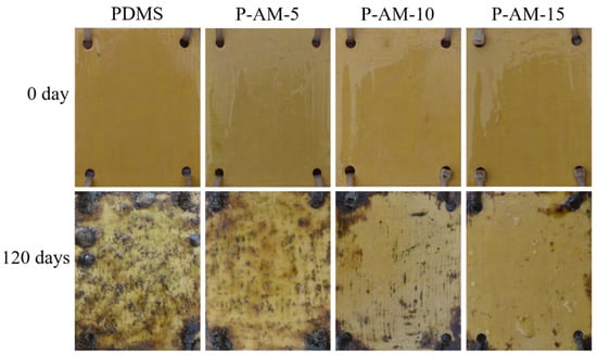 The antifouling performance of the P-AM coatings was further evaluated in a marine environment (Xiamen, China, 24°56′ N, 118°10′ E). Figure 4 shows the photographic images of the PDMS and P-AM-X coatings before and after immersion in seawater for 4 months. The coatings showed excellent durability and adhesion throughout the test period, as evidenced by their intact surfaces, free of any damage or peeling. The PDMS coating was found to be heavily covered with sea silt, accompanied by the presence of fresh algae, barnacles and their larvae. The surface of P-AM-5 showed a significant reduction in marine silt adhesion and a reduction in barnacle and algae adhesion. The surface of P-AM-10 showed no apparent fouling organisms, although there were minor accumulations of algae and marine sediment. The surface of the P-AM-15 coating showed minimal fouling organisms and only a negligible amount of marine silt deposition, indicating its exceptional antifouling biological properties. These results further demonstrate that the amphiphilic modification of PDMS can effectively enhance the antifouling performance of silicone coatings, giving them long-term potential for marine antifouling.