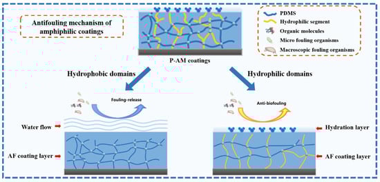 Poly(dimethylsiloxane) (PDMS) is a highly effective FRC due to its low surface energy and modulus of elasticity [,], which facilitates the efficient removal of macrofouling organisms such as barnacles by seawater washing. However, the effectiveness of PDMS-based coatings in preventing fouling organism settlement is limited by non-specific binding effects. In particular, PDMS exhibits inadequate resistance to the accumulation and growth of marine slime layers composed of bacteria, algae and the secretion of extracellular polymers [,]. Researchers have found that the formation of a hydrated layer by hydrophilic polymers (e.g., PEG-based coatings) effectively prevented fouling organisms from settling in the early stages []. However, once attached to the surface, the release of fouling organisms became difficult due to the properties of the coating []. Therefore, a more promising antifouling strategy is to create amphiphilic polymers by physically mixing or chemically crosslinking hydrophilic and hydrophobic polymers [,].