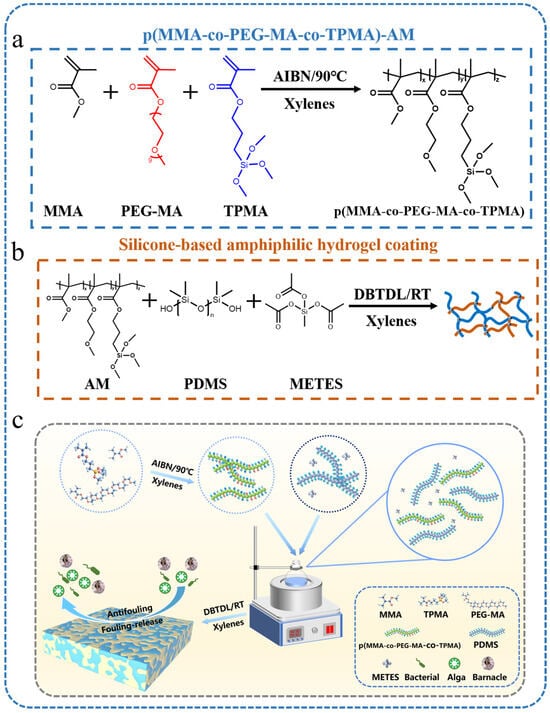 (a) Synthesis of poly(MMA-co-PEG-MA-co-TPMA). (b) The synthesis route of the silicone-based amphiphilic co-networks coating. (c) Synthetic scheme.