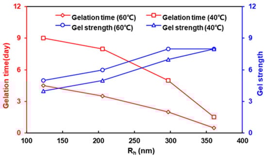 | Mw of HPAM (×106 Da) | Hydrolysis Degree (%) | Hydrodynamic Radius (nm) | Temperature (°C) | Gelation Time (Day) | Strength Code |