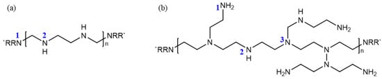| PEI Type | Molecular Weight of Repeating Unit (g/mol) | Number of Repeating Units | Nitrogen in Primary Amine (%) | Nitrogen in Secondary Amine (%) | Nitrogen in Tertiary Amine (%) |