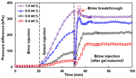 - Evaluation of the plugging performance: After all the injected gel had matured, brine was injected to determine the gel plugging performance.
