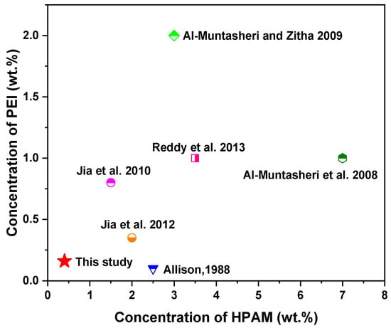 - Jia, H.; Pu, W.-F.; Zhao, J.-Z.; Jin, F.-Y. Research on the gelation performance of low toxic PEI cross-linking PHPAM gel systems as water shutoff agents in low temperature reservoirs. Ind. Eng. Chem. Res. 2010, 49, 9618–9624. [Google Scholar] [CrossRef]