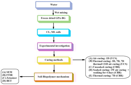 Based on the results and discussion, it is observed that the thermally treated GPA-BG-stabilized CL and ML soils recorded a maximum UCS of 3349 kN/m2 compared to air-cured soils. The contrast in CBR values between soaked curing with air- and thermal curing reveals that the biopolymer is highly suitable for arid, low-rainfall regions or pavements requiring temporary support. Despite air-curing for 7 days, the submergence of the soil sample reduced the CBR by 92%. Freeze-drying the GPA-BG strengthened the CL and ML soils by adhesion, amide bonds, and hydrogen bonds. The filling of pores and thermosetting contributed to increasing the strength of the stabilized soils. Curing time promoted flocculation, stiffening, and greater strength gain in addition to the filling of voids. A cost reduction of 12.56% is achievable for a 1 km stretch of the GPA-BG-stabilized ML soil flexible pavement due to the reduced thicknesses of the bituminous and granular layers.