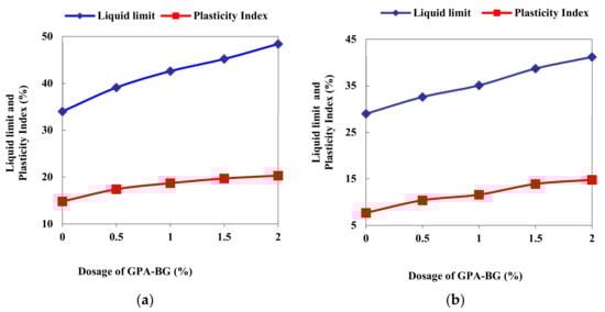 Liquid limit and plasticity index: (a) GPA-BG-stabilized CL; (b) GPA-BG-stabilized ML.