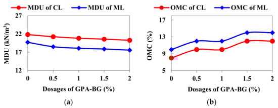 Standard proctor test curves: (a) MDU of GPA-BG-stabilized soils; (b) OMC of GPA-BG-stabilized soils.