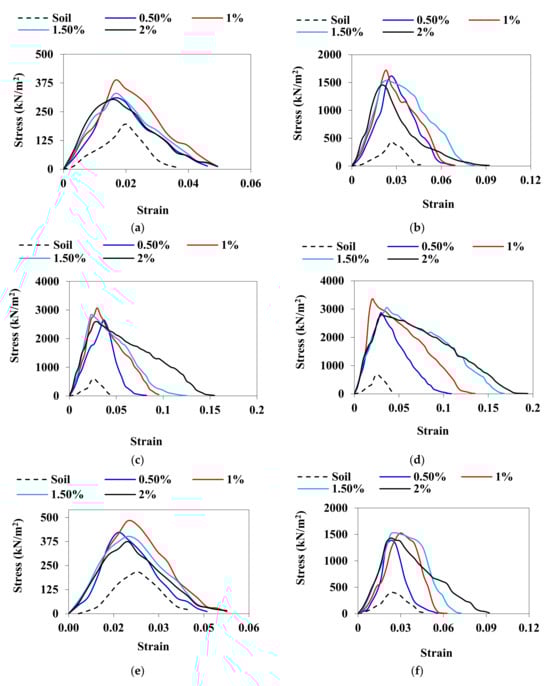 After 2 h of sample preparation, the UCS of GPA-BG-treated ML and CL soils was measured as 483 kN/m2 and 386 kN/m2, respectively. The untreated CL and ML soils that were not treated thermally showed a UCS of 316 kN/m2 and 268 kN/m2, respectively. The highest UCS was achieved through thermal curing of the two soils. The CL soil showed the highest UCS after 28 days of curing, reaching 3349 kN/m2 with a 1% addition of GPA-BG biopolymer. GPA-BG-stabilized CL showed a noticeable 911% maximum rise in UCS during the initial 7 days of the cured specimens, in contrast to the rate of strength gain from 7 days to 28 days. The stress–strain behavior of untreated and treated soils and the failure mode are shown in Figure 5 and Figure 6, respectively.