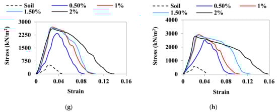 UCS test curves: (a) GPA-BG–CL: 2 h; (b) GPA-BG–CL: 3 days; (c) GPA-BG–CL: 7 days; (d) GPA-BG–CL: 28 days; (e) GPA-BG–ML: 2 h; (f) GPA-BG–ML: 3 days; (g) GPA-BG–ML: 7 days; (h) GPA-BG–ML: 28 days.