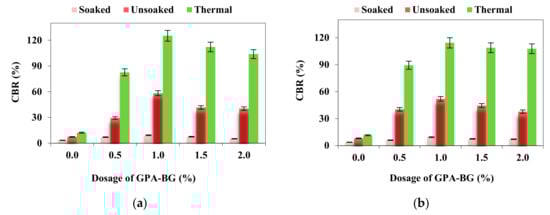 The maximum CBR for the soaked, unsoaked, and thermally cured 1% GPA-BG-stabilized ML specimens was found to be 9.38%, 52.05%, and 114.41%, respectively. The flexible pavement design was based on the worst-case situation, which was the soaked state, as defined by IRC []. Figure 7 reveals that both control soils were not suitable for the subgrade preparation of flexible pavement.