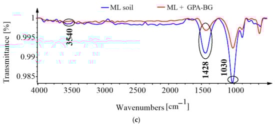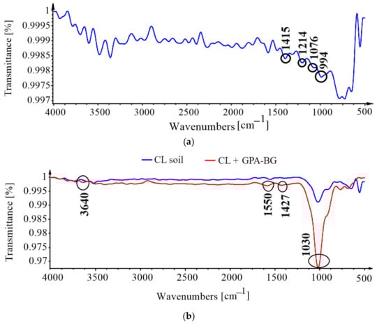 The characteristic bands of the spectra that represent the wavenumbers that are displayed in Figure 8 are demonstrated by the corresponding wavenumbers that resulted from the molecular vibrations that occurred as a result of the interaction between GPA-BG and ML and CL soils.