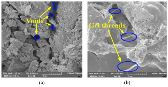 According to the illustration in Figure 9a, the pore gaps in the soils could have been the result of inadequate hydration and the loose packing of individual grains. Figure 9b demonstrates the structural alteration that occurred as a result of treatment with biopolymers.