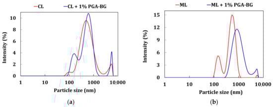 Zetasizer particle size: (a) GPA-BG-stabilized CL; (b) GPA-BG-stabilized ML.