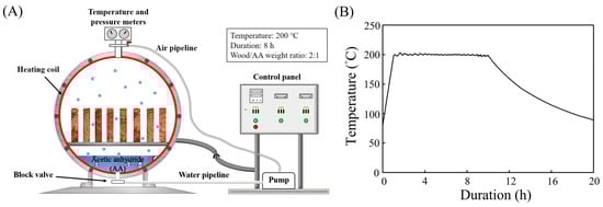 A semi-industrial level treatment chamber with controlled temperature and pressure (San Neng Ltd., Chiayi, Taiwan) was used for the high-temperature vapour-phase acetylation (HTVPA) treatment, as shown in Figure 1A. The selection of treatment conditions was based on findings from our previous research [26]. To obtain an accurate weight percent gain (WPG), the specimens were first placed in the treatment chamber and dried at 105 °C for 48 h, and their oven-dry weights were recorded. Subsequently, Japanese cedar specimens and AA were added to the chamber with a solid–liquid ratio of 2:1 (w/w). The specimens (approximately 17,000 cm3) were elevated on wooden racks and spaced at regular intervals within the chamber to ensure direct contact between the wood and the vapour-phase AA. Additionally, the AA was placed on an iron tray at the bottom of the treatment chamber to minimise the risk of splashing onto the specimens. Then, a vacuum pump was used to reduce the pressure inside the chamber to 25 kPa, and the temperature was increased to 200 °C at a rate of 2 °C/min for an 8 h HTVPA treatment. During the experiment, as shown in Figure 1B, temperature profiles were recorded using a thermocouple logger (CHY506A, Taipei, Taiwan). After the reaction was completed, the chamber was allowed to cool to room temperature, and any remaining chemicals were removed. The modified specimens were further dried at 105 °C for 24 h, and their oven-dried weights were recorded to calculate the WPG. Finally, all specimens were conditioned at 20 °C and 65% relative humidity (RH) for subsequent testing.
