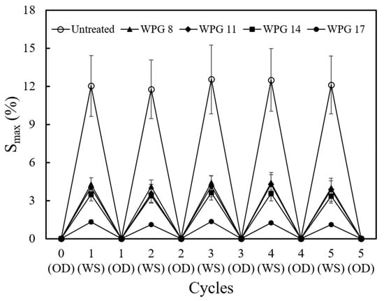Figure 2. Total volumetric swelling (Smax) of untreated and HTVPA-modified Japanese cedar wood samples with different cycles of water-soaking and oven-drying tests. OD: oven-drying. WS: water soaking. Values are mean ± SD (n = 7).