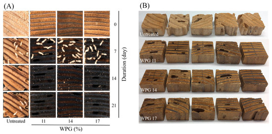 Figure 3. Images of untreated and HTVPA-modified Japanese cedar wood during (A) and after (B) the termite resistance test.