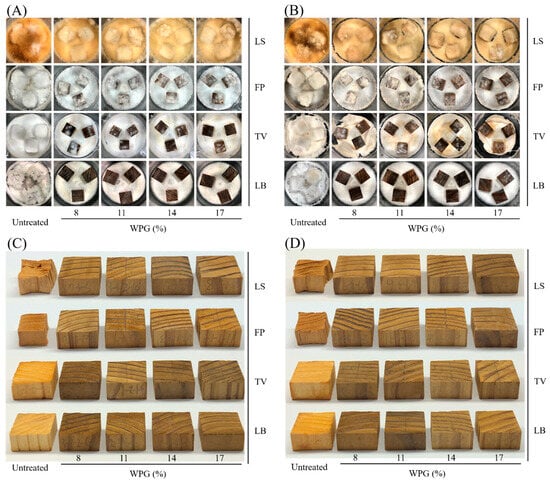 Figure 4. Mycelial growth and images of untreated and HTVPA-modified Japanese cedar wood after 12 (A,C) and 24 (B,D) weeks of the decay resistance test.