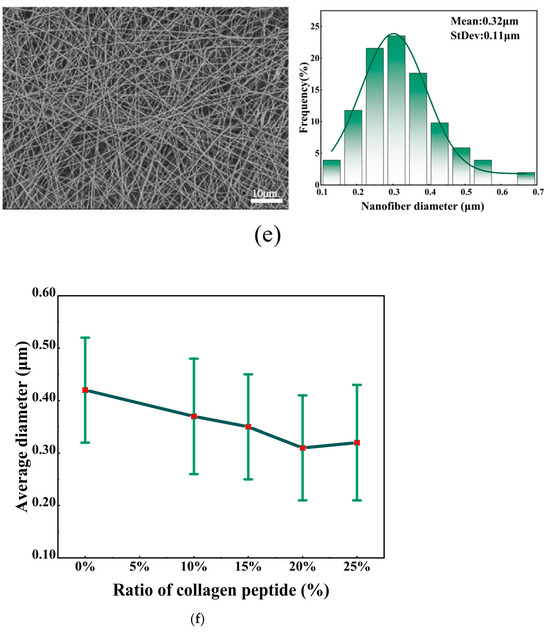 (a) SEM and diameter distribution diagram of facial mask fibers prepared with 0% collagen peptide solution; (b) SEM and diameter distribution diagram of facial mask fibers prepared with 10% collagen peptide solution; (c) SEM and diameter distribution diagram of facial mask fibers prepared with 15% collagen peptide solution; (d) SEM and diameter distribution diagram of facial mask fibers prepared with 20% collagen peptide solution; (e) SEM and diameter distribution diagram of facial mask fibers prepared with 25% collagen peptide solution; and (f) average fiber diameter of facial masks prepared with different collagen peptide solution ratios.