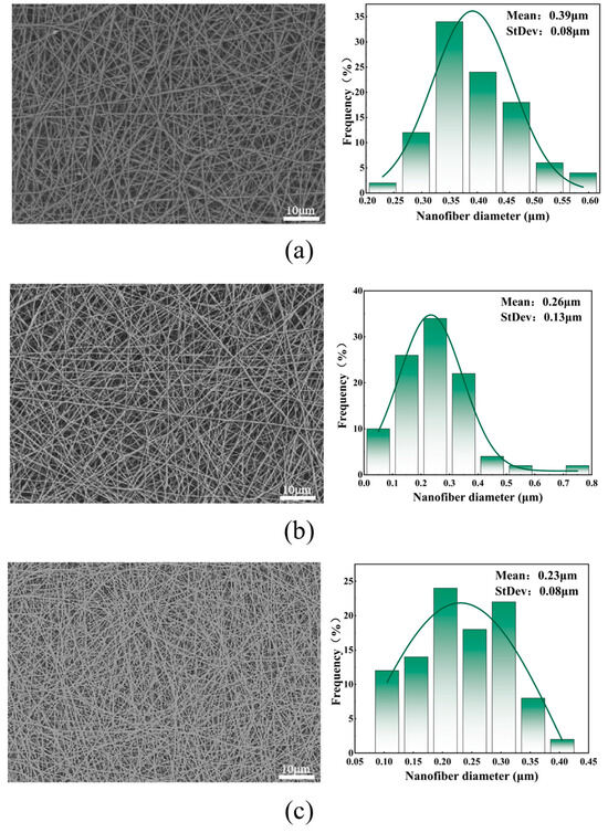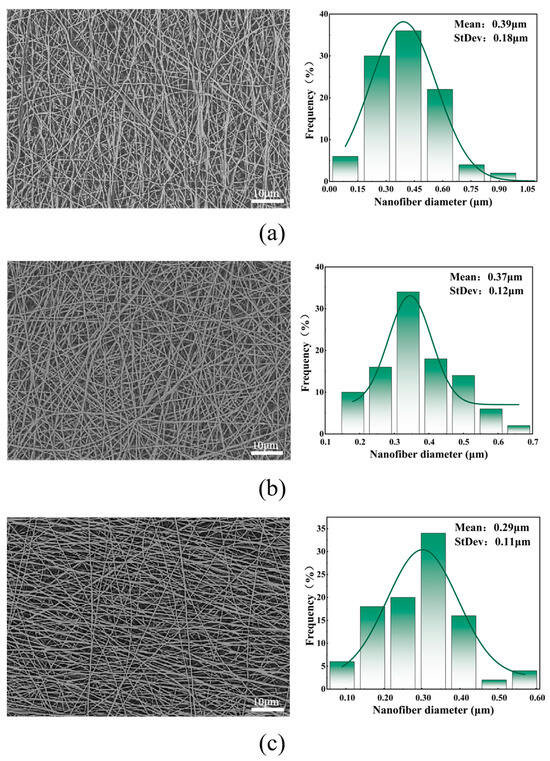Figure 4 shows the SEM images, fiber diameter distribution statistics, and average fiber diameter of the facial masks prepared at different receiving distances. Combining the Figure 4, it can be seen that the morphology of the facial mask fiber is significantly affected by the receiving distance. This is because changes in the receiving distance cause changes in two key factors in the electrospinning process: the multi-jet electric field intensity and the degree of solvent volatilization. In this experiment, when the receiving distance was short, there were two factors acting simultaneously. When the electric field intensity was high, the traction force on the jet was sufficient, which resulted in a reduction in the flight time of the jet and insufficient solvent volatilization, thus making the diameter of the fiber larger. As the distance increases, the flight time of the jet gradually increases, the degree of solvent volatilization gradually increases, and the diameter of the fiber becomes thinner. However, when the receiving distance was far, the volatilization degree of the solvent did not change much. At this time, the electric field intensity becomes the dominant factor. When the electric field intensity of the multi-jet decreases, the traction force of the jet is insufficient, which in turn makes the diameter of the fiber larger.
