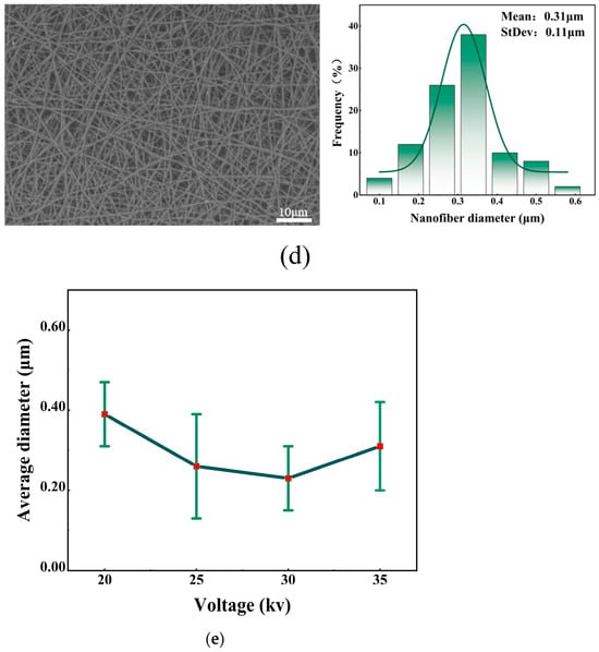 (a) SEM and diameter distribution diagram of facial mask fiber prepared at 20 kv voltage; (b) SEM and diameter distribution diagram of facial mask fiber prepared at 25 kv voltage; (c) SEM and diameter distribution diagram of facial mask fiber prepared at 30 kv voltage; (d) SEM and diameter distribution diagram of facial mask fibers prepared at 35 kv voltage; and (e) average fiber diameter diagram of facial masks prepared at different voltages.