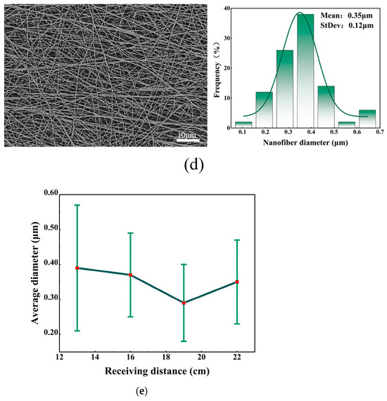 (a) SEM and diameter distribution diagram of facial mask fiber prepared with a receiving distance of 13 cm; (b) SEM and diameter distribution diagram of facial mask fiber prepared with a receiving distance of 16 cm; (c) facial mask fiber prepared with a receiving distance of 19 cm SEM and diameter distribution diagram; (d) SEM and diameter distribution diagram of facial mask fibers prepared with a receiving distance of 22 cm; and (e) average fiber diameter diagram of facial masks prepared with different receiving distances.