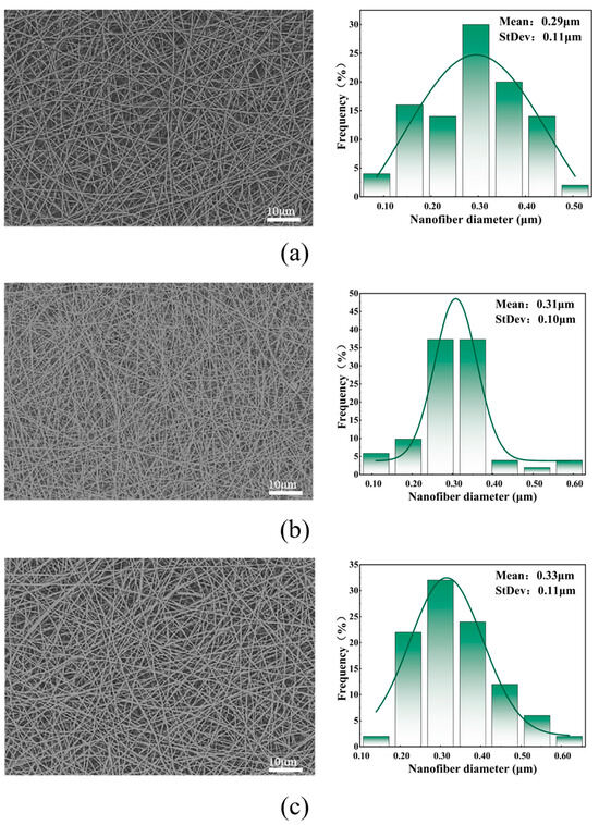 First, the nanofiber facial mask prepared by the needleless electrospinning device was cut and sampled in a targeted manner, and then a plasma thin-film sputtering instrument (GSL1100X-SPC-12, Hefei Kejing Material Technology Co., Ltd., in Hefei, China.) was used for gold spraying treatment, and then a Hitachi electron microscope equipment (TM4000, Shanghai Yiheng Scientific Instrument Co., Ltd., in Shanghai, China.) was used for detection. In order to prevent the fiber membrane from falling off during the vacuum extraction process, a mask sample of an appropriate size needs to be fixed on a metal specimen stage, and the fiber morphology magnified 1500 times was observed through an accelerating voltage of 5 kV. After taking the picture, ImageJ software (ImageJ 1.54g) was used to randomly select 50 fibers for measurement, and Origin software (Origin 2021) was used to count the fiber diameter distribution.