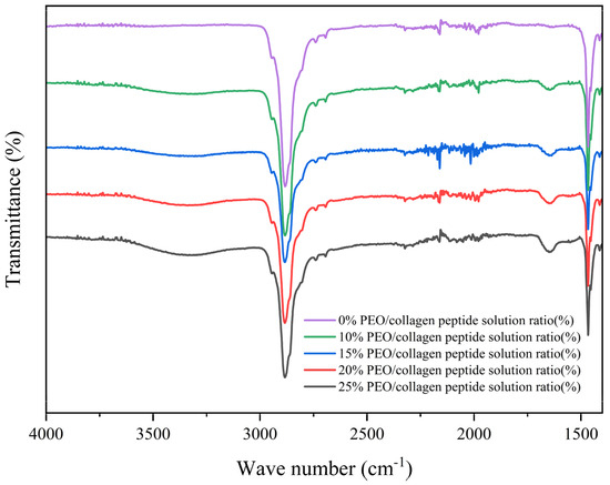 A Nicolet IS50 Fourier transform infrared spectrometer is a device that uses substances to analyze the absorption characteristics of infrared radiation of different wavelengths. This equipment can quickly analyze the chemical structure and composition of the PEO/collagen peptide nanofiber mask without damaging it. In this experiment, five groups of PEO/collagen peptide nanofiber facial masks prepared with different ratios were subjected to infrared spectrum detection. The results treated with Origin are shown in Figure 6.