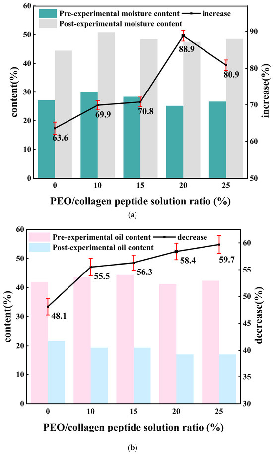 (a) Effects of different proportions of collagen peptide content on skin moisture; (b) effects of different proportions of collagen peptide content on skin oil content.