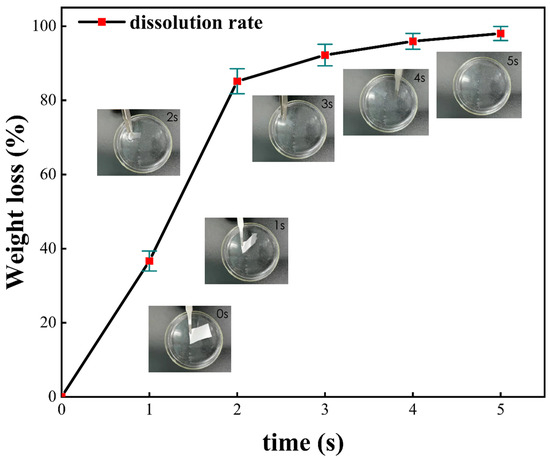 The quick-dissolving dissolution experimental process of the PEO/collagen peptide nanofiber mask is shown in Figure 8. The time in the upper right corner indicates the dissolution of the nanofiber mask at this time. It can be clearly seen that the PEO/collagen peptide nanofiber mask sample begins to dissolve the moment it is put into the ionized water, and quickly spreads around. Within 3 s, most of the main body of the mask disappeared, visible to the naked eye, leaving some tiny particles floating in the water. At this time, the dissolution rate gradually slowed down. At 5 s, the fiber particles had completely dissolved. During the whole process, it can be clearly seen that the PEO/collagen peptide nanofiber mask dissolves very quickly, and as time goes by, the dissolution rate gradually decreases.