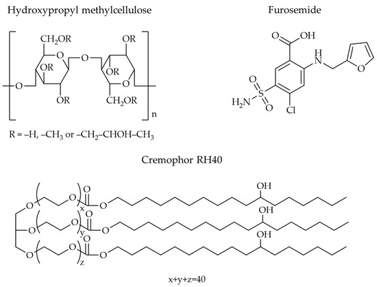 Furosemide (FM) was purchased from TCI (Tokyo, Japan). Hydroxypropyl methylcellulose HPMC K4M (H-K4M) has a molecular weight of 320,000–380,000 Da, and the substituent of the methoxy group is 22% and that of the hydroxypropyl group is 8.1% [16]. H-K4M was manufactured by Dow Chemical Company (Midland, MI, USA) and kindly supplied by Rama Production Co., Ltd. (Bangkok, Thailand). Castor oil and glyceryl monostearate (GMS) were purchased from PC Drug Co., Ltd. (Bangkok, Thailand). Cremophor RH40 was purchased from Chemipan Corporation Co., Ltd. (Bangkok, Thailand), and PEG400 from Union Chemical 1986 Co., Ltd. (Bangkok, Thailand). All other chemicals in this study were of analytical grade and were used as supplied.