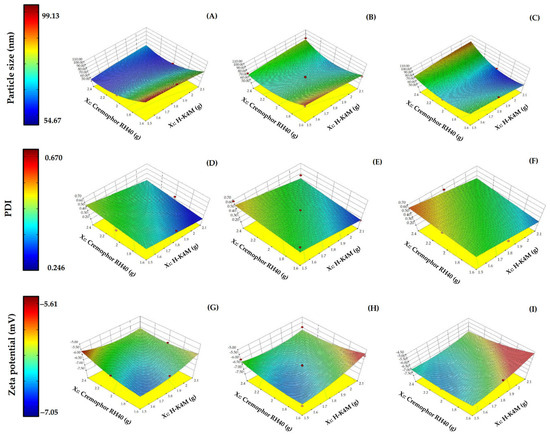 The particle size distribution (PDI) ranges from 0.246 to 0.670 (Figure 2D–F). Generally, PDI values below 0.7 are considered suitable for testing with dynamic light scattering [35]. A lower PDI value indicates a narrower size distribution [36]. Increasing the Cremophor RH40 concentration did not significantly affect the PDI, while higher H-K4M concentrations tended to decrease the PDI. This is likely because H-K4M is a polymer with a large molecular weight and chain length, which can hinder the aggregation of small particles, resulting in a narrower particle size distribution. Regarding the effect of mixing speed, there may not be a clear effect on particle size with increasing mixing speed. However, at the lowest H-K4M concentration and highest Cremophor RH40 concentration, it was observed that increasing the mixing speed from 700 rpm to 1100 rpm changed the color of the 3D surface from light green to orange. This indicates that there is an increase in size distribution with increasing mixing speed under these conditions.