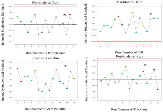 The corresponding residual plot between the run number and the internally studentized residuals for various responses of particle size (A), PDI (B), zeta potential (C), and thickness (D).