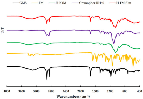 FTIR spectra of GMS, FM, H-K4M, Cremophor RH40, and H-FM film.