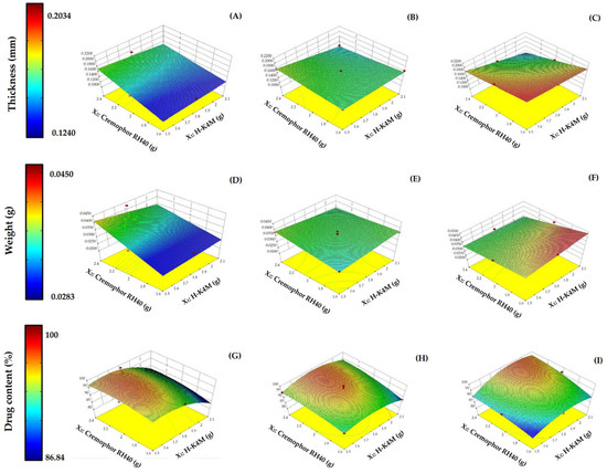 3D surfaces of H-FM films for thickness (A–C), weight (D–F), and drug content (G–I) with mixing speeds of 700 rpm (left column), 900 rpm (middle column), and 1100 rpm (right column). (Red dots over the 3D surface refer to design points above the predicted value. Red dots under the 3D surface refer to design points below the predicted value).