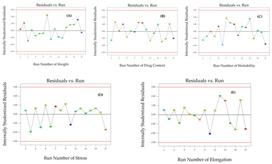 The corresponding residual plot between the run number and the internally studentized residuals for various responses of weight (A), drug content (B), wettability (C), stress (D), and elongation (E).