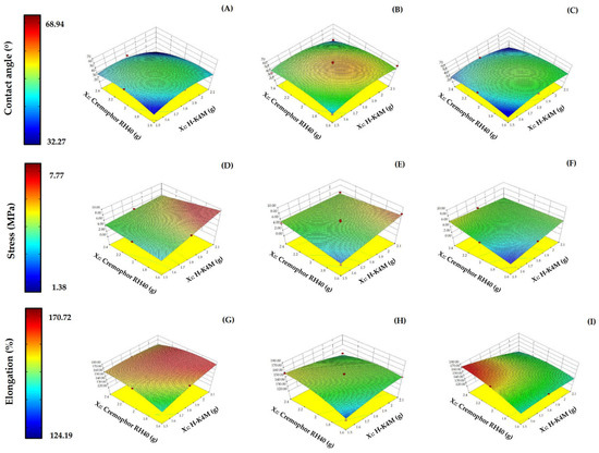 3D surfaces of H-FM films for contact angle (A–C), stress (D–F), and % elongation (G–I) with mixing speeds of 700 rpm (left column), 900 rpm (middle column), and 1100 rpm (right column). (Red dots over the 3D surface refer to design points above the predicted value. Red dots under the 3D surface refer to design points below the predicted value).