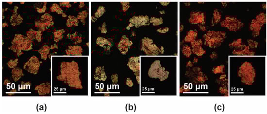 Preliminary optical micrographs were taken at 200× and 500× magnifications using an optical microscope (AxioScope 2, Carl Zeiss, Braunschweig, Germany) to determine geometry and surface microstructure of investigated Cu flakes (Figure 1). All three types of flakes used exhibited irregular flake edges and a coarse flake surface with an average equivalent diameter of ~30 µm and thickness of ~0.7 μm, giving an aspect ratio of ~40. Furthermore, the surfaces of the flakes were not uniformly covered with the coating material. In addition, the Cu@Ag flakes had a greyish appearance, while the Cu@Si flakes had a more brilliant copper appearance, as stated by the manufacturer.
