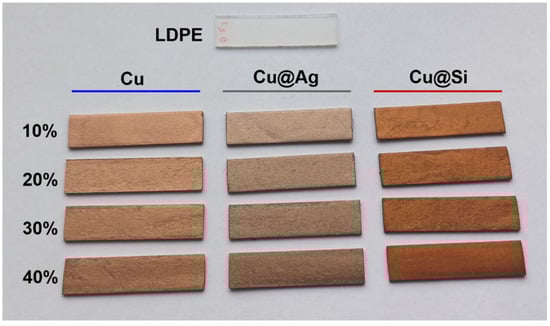 Cu-based composites were prepared using commercially available low-density polyethylene-LDPE (780E NATURAL, Dow Chemical Company, Midland, MI, USA) with a density of ρLDPE = 0.923 g/cm3 and copper-based fillers with different metal coatings: uncoated copper flakes, Cu (STANDART Lac L 900, Eckart, Hartenstein, Germany) with a density of ρCu = 8.5 g/cm3, silver coated copper flakes, Cu@Ag (eConduct Cu 341000, Eckart, Hartenstein, Germany) and silica-coated copper flakes, Cu@Si (STANDART RESIST LT, Eckart, Hartenstein, Germany). The mass concentration, Φm, of coating material was constant, i.e., Φm = 10% for Ag and Si.