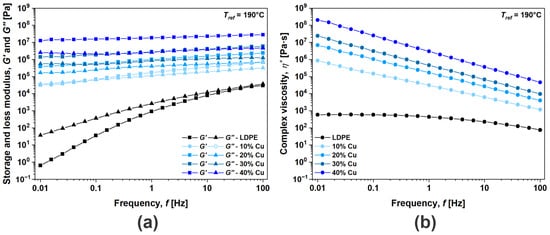 Figure 3. Viscoelastic properties: (a) storage and loss modulus; (b) complex viscosity as a function of frequency for Cu composites.